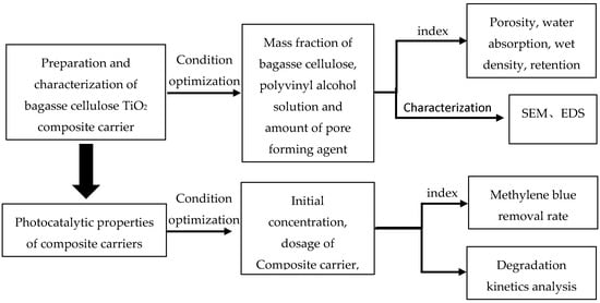 To develop an environment-friendly and biodegradable photocatalytic response composite carrier, this paper used bagasse cellulose as the basic framework. It has the advantages of simple preparation process, strong adsorption [22,23,24], high porosity [25,26] and high specific surface of materials to be used to load titanium dioxide, which is an ideal carrier for biofilm loading. We used Nano-TiO2 as the photocatalyst, and taking methylene blue (MB) as the target pollutant—studied the physical and chemical properties and photocatalysis of the composite carrier. The degradation efficiency of MB was also investigated to provide reference for optimizing ICPB system. This study is carried out according to the flow chart (Figure 1).