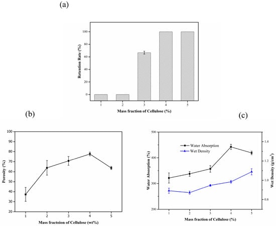 Effect of the mass fraction of cellulose on the properties of the composite carrier. (a) Effect of the mass fraction of cellulose on retention rate; (b) Effect of the mass fraction of cellulose on porosity; (c) Effect of the mass fraction of cellulose on water absorption and wet density.