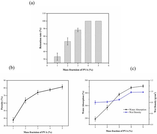 Influence of PVA mass fraction on the performance of composite carrier. (a) Effect of the mass fraction of PVA on retention rate; (b) Effect of the mass fraction of PVA on porosity; (c) Effect of the mass fraction of PVA on water absorption and wet density.