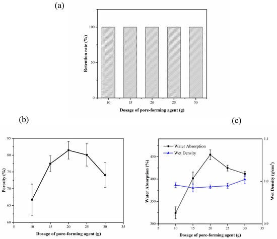 Effect of pore-forming agent dosage on the properties of composite carrier. (a) Effect of the dosage of pore-forming agent on retention rate; (b) Effect of the dosage of pore-forming agent on porosity; (c) Effect of the dosage of pore-forming agent on water absorption and wet density.