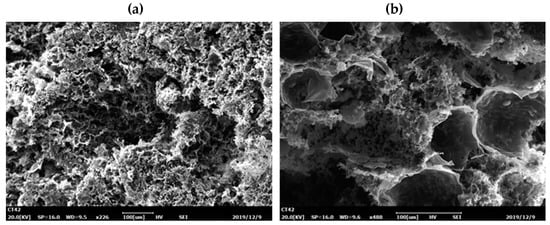 Figure 2b shows that with the increase in the bagasse cellulose content, the porosity of the composite carrier increases first and then decreases. The maximum porosity was 77.68% for a bagasse cellulose content of 4%. The increased porosity can be mainly attributed to the role of bagasse cellulose solution as a backbone of the foaming material, hindering the diffusion of the bubbles from viscose. It can effectively prevent the cavity generated after foaming from collapsing due to the surrounding non-solidified solution, which was conducive to the formation probability of the cavity [30]. However, when the content of bagasse increased to 5%, the bubbles could not resist the bagasse cellulose, resulting in the tight internal pore structure, so the porosity could not be increased continuously.