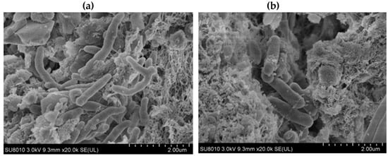 Figure 5 shows SEM images of the TiO2 and biofilms on the surface and in the core of the SBC-TiO2. The images confirm the composite carrier was rough, with obvious pore structures, which was beneficial to the adhesion and growth of micro-organisms. Figure 6 shows the successful aggregation of the micro-organisms inside and outside the carrier.