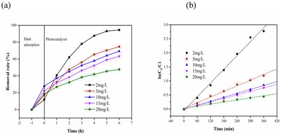 Figure 8 shows the removal rate and reaction kinetics for different initial concentrations of MB (pH 6, the dosage of composite carrier 2 g). As shown in Figure 8a, the adsorption capacity increases gradually with the increase in the initial concentration and then decreases gradually after reaching a maximum at 10 mg L−1 under dark adsorption during the first hour. After 6 h of photocatalytic reaction, the final removal rate decreases with the increase in initial concentration. As shown in Figure 8b, the photocatalytic degradation rate decreases with the increase in the initial concentration. The reaction rate was highest at 2 mg L−1, which was 6.65 times higher than that at 20 mg L−1.