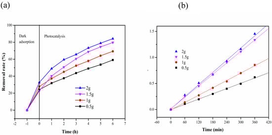 Figure 9 shows the removal rate and reaction kinetics of MB under different dosages of the composite carrier (MB 10 mg/L, pH 6). Figure 9a shows that the removal rate was highest when the dosage was 2 g in the first hour of dark adsorption, because the number of structural sites of MB that can be adsorbed correspondingly increases with the increase in the dosage. After 6 h of photocatalysis, the final degradation efficiency increases with the increase in the dosage. When the dosage of the composite carrier was 2 g, the highest removal rate was 84.24%. As shown in Figure 9b, when the dosage was 2 g, the maximum reaction constant k was 3.89 × 10−3 min−1. After the dosage was increased to a certain extent, the reaction rate decreases, which can be explained by the availability of titanium dioxide surface active sites and light penetration in the suspension [33].