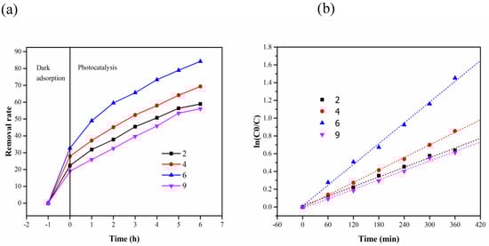 Figure 10 shows the removal efficiency and reaction kinetics of MB at different pH (MB 10 mg/L, the dosage of composite carrier 2 g). In Figure 10a, the removal rate of MB was highest at a pH of 6 after 6 h. A strong acid or alkali cannot accelerate the removal of MB. This was because the pH value of the solution affects the absorption of hydroxyl on titanium dioxide [34]. As shown in Figure 10b, the reaction rates at pH = 2, 4, 6 and 9 were 1.81 × 10−3, 2.35 × 10−3, 3.89 × 10−3 and 1.78 × 10−3 min−1, respectively. This also shows that the photocatalytic oxidation of MB was not conducive to over-acidic and over-alkaline conditions.
