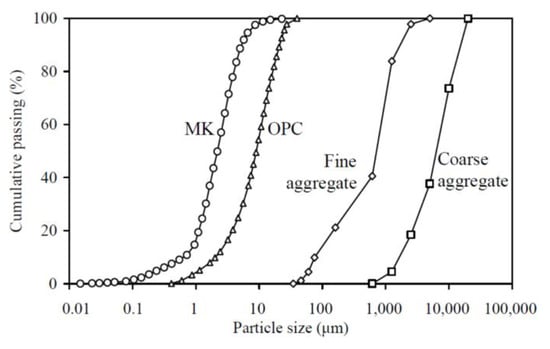 The particle size distributions of the OPC and MK were measured with a laser diffraction particle size analyzer, and the particle size distributions of the fine aggregate and coarse aggregate were measured by mechanical sieving, as depicted in Figure 1. The volumetric mean particle sizes of the OPC, MK, fine aggregate, and coarse aggregate were 9.34 μm, 3.20 μm, 0.78 mm, and 7.24 mm, respectively, as calculated from the particle size distributions. The chemical compositions of the OPC and MK were obtained through the X-ray diffraction method, as displayed in Table 1, and their micrographs were obtained through scanning electronic microscopy, as displayed in Figure A1 in the Appendix. The particle size distributions and micrographs both suggested that the MK is finer than OPC, such that the MK particles can fill into the interstitial space between the OPC particles to achieve denser packing of the solid skeleton.