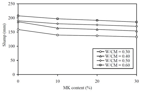 The slump results are plotted against the MK contents at various W/CM ratios in Figure 2 and tabulated in the second column of Table A1 in the Appendix for easy capturing of exact values of data. It is seen that the curve for a higher W/CM ratio is generally higher in the figure, showing that, regardless of the MK content, a MK concrete with higher W/CM ratio always has higher deformability. More importantly, it is also seen that within the range of W/CM ratios covered in this study, the addition of MK decreased the deformability. Nonetheless, the decrease in slump with increase in MK content was quite gentle. Particularly, the addition of 30% MK only lowered the slump by 16.4%, 17.4%, 10.3%, and 10.6% at W/CM ratios of 0.30, 0.40, 0.50, and 0.60, respectively. These results are in close agreement with Muduli and Mukharjee [14] who reported that the addition of MK slightly reduced the workability of recycled coarse aggregate concrete. On average, the addition of 30% MK rendered an approximately 14% decrease in the slump.