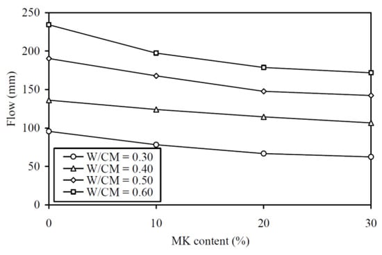The flow results are plotted against the MK contents at various W/CM ratios in Figure 3 and tabulated in the third column of Table A1. Again, the curve for a higher W/CM ratio is generally higher in the figure, showing that a MK concrete with higher W/CM ratio always has higher flowability. More importantly, within the range of W/CM ratio covered in this study, the addition of MK decreased the flowability, but the actual decrease in flow with increase in MK content was only moderate, albeit the percentage decrease in flow was larger than the respective percentage decrease in slump. For instance, the addition of 30% MK lowered the flow by 34.7%, 21.6%, 25.2%, and 26.6% at W/CM ratios of 0.30, 0.40, 0.50, and 0.60, respectively. On average, the addition of 30% MK rendered an approximately 27% decrease in the flow.