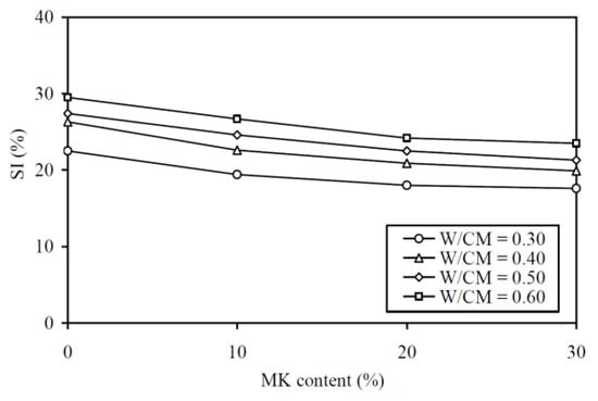 The SI results are plotted against the MK contents at various W/CM ratios in Figure 4 and are tabulated in the fourth column of Table A1 in the Appendix for easy capturing of exact values of data. It is noted that the curve for a higher W/CM ratio is generally higher in the figure, showing that a MK concrete with higher W/CM ratio always has higher SI, or, in other words, lower segregation stability. More importantly, it is evident that within the range of W/CM ratios covered in this study, the addition of MK lowered the SI. Basically, the addition of 30% MK lowered the SI by 21.8%, 24.3%, 22.3%, and 20.3% at W/CM ratios of 0.30, 0.40, 0.50, and 0.60, respectively. On average, the addition of 30% MK lowered the SI by about 22%.
