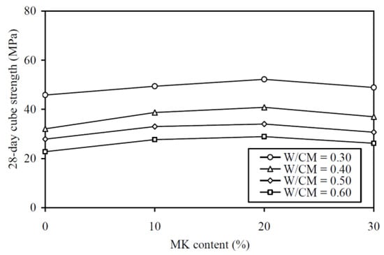 The 28-day cube strength results are plotted against the MK contents at various W/CM ratios in Figure 5 and are tabulated in the fifth column of Table A1 in the Appendix for easy capturing of exact values of data. As expected, the curve for a higher W/CM ratio is generally lower in the figure, showing that a MK concrete with higher W/CM ratio always has lower 28-day cube strength. More importantly, at the same W/CM ratio, the addition of MK up to 20% significantly increased the 28-day cube strength, while further addition of MK to 30% turned to slightly decrease the 28-day cube strength. These results are somehow contradictory with Hassan et al. [12] and Valipour et al. [19,20], who reported that the addition of MK always increased the compressive strength. Basically, the addition of 20% MK increased the 28-day cube strength by 14.0%, 27.1%, 21.9%, and 26.8% at W/CM ratios of 0.30, 0.40, 0.50, and 0.60, respectively. On average, the addition of 20% MK increased the 28-day cube strength by approximately 22%. These results are in close agreement with Shen et al. [10], who reported that incorporating 10% to 25% MK as cement replacement resulted in comparable percentage increases in 28-day compressive strength.