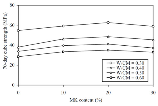 The 70-day cube strength results are plotted against the MK contents at various W/CM ratios in Figure 6 and are tabulated in the sixth column of Table A1. Similar to the trend of 28-day cube strength, the curve for a higher W/CM ratio is generally lower in the figure, showing that MK concrete with higher W/CM ratio always has lower 70-day cube strength. More importantly, at the same W/CM ratio, the addition of MK up to 20% significantly increased the 70-day cube strength, while further addition of MK to 30% turned to slightly decrease the 70-day cube strength. This is similar to the variation of the 28-day cube strength with the MK content. Specifically, the addition of 20% MK increased the 70-day cube strength by 14.7%, 27.6%, 21.7%, and 23.2% at W/CM ratios of 0.30, 0.40, 0.50, and 0.60, respectively. On average, the addition of 20% MK increased the 70-day cube strength by approximately 22%.