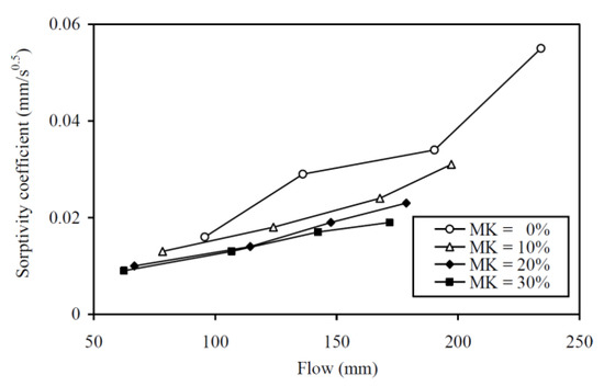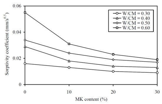 Sorptivity coefficient versus MK content at various W/CM ratios.