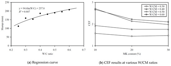 To evaluate the CEF of MK for deformability (in terms of slump), regression analysis for correlating the slump to the equivalent W/C ratio was carried out, as shown in Figure 8a. The regression analysis yielded an R2 value of 0.887 and the best-fit curve plotted alongside the data points in the figure. This fairly high R2 value and the closeness of the data points to the best-fit curve proved that the relationship between the slump and effective W/C ratio was applicable for evaluating the slump CEF. The slump CEFs obtained are plotted against the MK contents at various W/CM ratios in Figure 8b and tabulated in the third column of Table A2 in the Appendix for easy capturing of exact values of data. It is seen that the slump CEF of MK varied from 1.44 to 2.71 and it had an average value of 1.98. Somehow, the curve for a higher W/CM ratio is generally higher in the figure, which indicated that the slump CEF of MK is larger at a higher W/CM ratio. It should be noted that a slump CEF of MK larger than 1.0 means that the addition of MK as OPC replacement would decrease the slump, and the larger the value of slump CEF, the greater is the adverse effect on slump.
