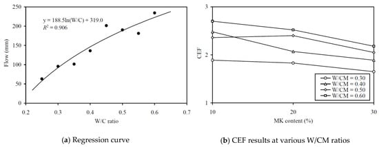 To evaluate the CEF of MK for flowability (in terms of flow), regression analysis for correlating the flow to the equivalent W/C ratio was carried out, as shown in Figure 9a. The regression analysis yielded an R2 value of 0.906 and the best-fit curve is plotted alongside the data points in the figure. The good correlation proved that the relationship between the flow and effective W/C ratio was applicable for evaluating the flow CEF. The flow CEFs obtained are plotted against the MK contents at various W/CM ratios in Figure 9b and tabulated in the fourth column of Table A2. In general, the flow CEF of MK varied from 1.65 to 2.70 and it had an average value of 2.17. As before, the curve for higher W/CM ratio is generally higher in the figure, which indicated that the flow CEF of MK is larger at a higher W/CM ratio. Again, it should be noted that a flow CEF of MK that is larger than 1.0 means the addition of MK as OPC replacement would decrease the flow, and the larger the value of flow CEF, the greater is the adverse effect on flow.