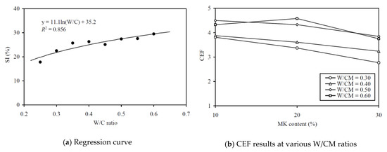 The formula proposed by Smith [63] and Hobbs [64], as given by Equation (3) below, is adopted in order to determine the CEFs with respect to the workability, cohesiveness, strength, and durability. Firstly, the correlation between each performance attribute and the W/C ratio was established by regression analysis of the test results of a number of concrete samples with no MK added. Subsequently, for each performance attribute of the concrete samples with different amounts of MK added and from the correlation between the performance attribute and the W/C ratio established above, the equivalent W/C ratio of each concrete sample was calculated. Finally, the CEF of the MK for each performance attribute was worked out through the following equation:
