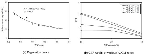 Regression curve and CEF results for 28-day cube strength at various W/CM ratios.