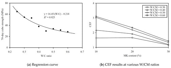 Regression curve and CEF results for 70-day cube strength at various W/CM ratios.