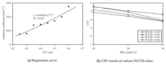 To evaluate the CEF of MK for sorptivity (in terms of sorptivity coefficient), regression analysis has been carried out to correlate the sorptivity coefficient to the equivalent W/C ratio, as in Figure 13a. A very high R2 value of 0.926 was obtained, proving that the relationship between the sorptivity coefficient and effective W/C ratio was applicable for evaluating the sorptivity CEF. The sorptivity CEFs so obtained are plotted against the MK contents at various W/CM ratios in Figure 13b and are tabulated in the last column of Table A2 in the Appendix for easy capturing of the exact values of data. These results show that the sorptivity CEF of MK varied from 3.80 to 5.58 and had an average value of 4.70. As for the other performance attributes, the curve for higher W/CM ratio is generally higher in the figure, showing that the sorptivity CEF of MK is generally larger at a higher W/CM ratio. Moreover, at all W/CM ratios, the sorptivity CEF of MK is generally smaller at higher MK content. This is probably due to the gradual saturation of the micro-filling effect of the MK and the diminishing return of the micro-structural densification when the MK added is about to fill up the voids between the larger size particles.