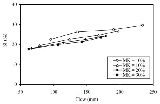 To illustrate the concurrently achieved cohesiveness and flowability at different MK contents, the cohesiveness is plotted against the flow in Figure 14. The figure shows that an increase in MK content shifts the SI-flow curve downwards, indicating that the addition of MK would, at the same flowability, improve the cohesiveness. This is echoed by the finding that the CEF values for SI are always larger than those for flow. As both cohesiveness and flowability are needed for self-consolidating concrete [65,66,67], such increase in cohesiveness at the same flowability, i.e. improvement in concurrent cohesiveness-flowability performance, due to MK addition, demonstrates that MK is a useful SCM for producing self-consolidating concrete.