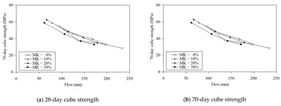 To illustrate the concurrently achieved strength and flowability at different MK contents, the 28-day and 70-day cube strengths are plotted against the flow in Figure 15. The figure shows that the addition of up to 20% MK shifts both the 28-day strength-flow curve and the 70-day strength-flow curve to the left, but neither upwards or downwards. Hence, within the range of MK concrete mixes produced for testing, the addition of up to 20% has little effect on the concurrent strength-flowability performance. This is echoed by the finding that the CEF values for flow and those for strength are quite close to each other at MK content not higher than 20%. However, the addition of 30% MK shifts both the 28-day strength-flow curve and the 70-day strength-flow curve to the left and slightly downwards. Hence, within the range of MK concrete mixes produced for testing, the addition of 30% MK has a slight adverse effect on the concurrent strength-flowability performance. This is echoed by the finding that, at MK content equal to 30%, the CEF values for flow are higher than those for strength. This might be a bit disappointing, but such an adverse effect on concurrent strength-flowability performance could be avoided by limiting the MK content to at most 20%.