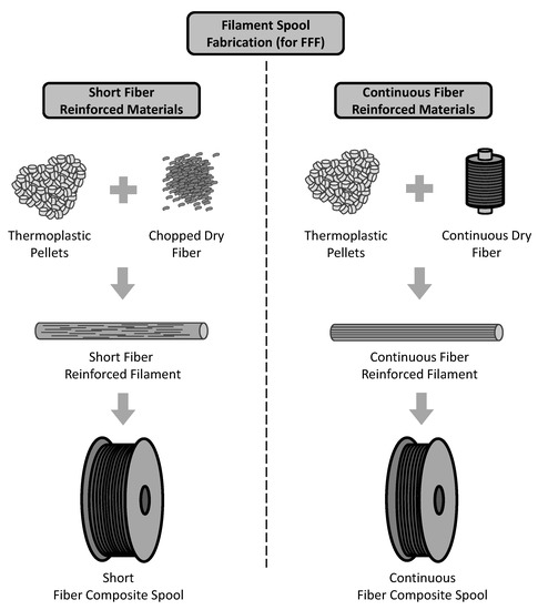 Among the processes contemplated in AM [7], the material extrusion based technology Fused Filament Fabrication (FFF) has been playing an important role. This can be attributed to several aspects among which it can be highlighted the high offer of open source machines with affordable costs, the availability of open access information on software and hardware and possibility of production of parts with some mechanical responsibility. Consequently, its application for final parts has been studied for different sectors over the last years [8,9,10,11]. Additional details about the traditional FFF process are presented by Guo and Leu in [6]. In regards to the feedstock material, the FFF process, which is also referred by the general term 3D-printing, is currently able to produce thermoplastic fiber reinforced parts in addition to the initial unreinforced ones. The most common fiber reinforced thermoplastic filaments contain short reinforcing fibers, although continuous reinforcing fibers have also been successfully introduced into this technology [12,13]. Figure 1 depicts the basic differences in the fabrication of short fiber reinforced filaments compared to continuous fiber reinforced filaments. It must be noted that different impregnation processes can be applied in order to blend the thermoplastic matrix with the reinforcing fibers. Although the length of the chopped dry fibers may vary from one supplier to another, normally they are very small in order to prevent clogging issues during the extrusion process, e.g., Ning et al. reported in [14] that chopped dry fibers had length of and , and Ferreira et al. [15] reported chopped dry fibers of length . Another limitation of using short reinforcing fibers is the fiber volume content as Wang et al. reported in [13]. Thus, the introduction of continuous reinforcing fibers has been adopted as an option to produce stiffer and stronger parts.