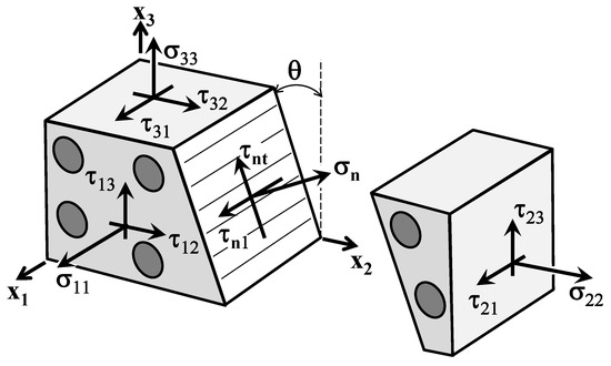 Stress state associated with fiber reinforced composites where , and are the stresses on the action plane and is the rotation of 2-face about the 1-axis (Adapted from [57]).