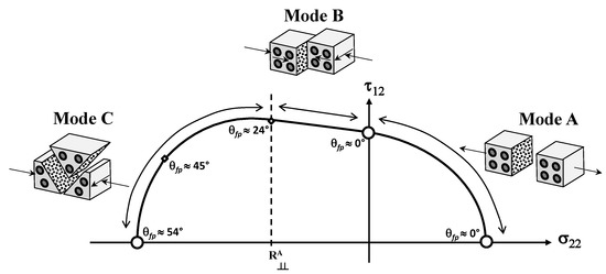 From the experimental results obtained for unidirectional fiber reinforced composite materials in [54], here categorized as intrinsically brittle materials according to Table 2, Equation (2a), Equation (2b) can substantially simplify the implementation for a given plane stress-state since no numerical search of the fracture plane is required. According to the experimental results in [54], it was verified that a plane stress case led to a fracture plane when subject to any . When subjected to , Puck and Schürmann [54] also found that there is a part of the fracture envelope where the fracture plane . According to them, the fracture is originated by whilst impedes fracture. In the other part of the compression side, the fracture plane changes from to . Thus, although based on a simplified form of the 3D criterion, the derived 2D formulation requires a separate inspection of three modes on the stress space as can be seen in Figure 4. More details about this simplification, which includes surveying and distinguishing the fracture conditions between Mode A, B and C, can be found in [54,55]. Although the failure envelope is not symmetric to any vertical line, it has a symmetry with respect to the abscissa axis. Therefore, in Figure 4 the fracture curve is shown only for positive values of .
