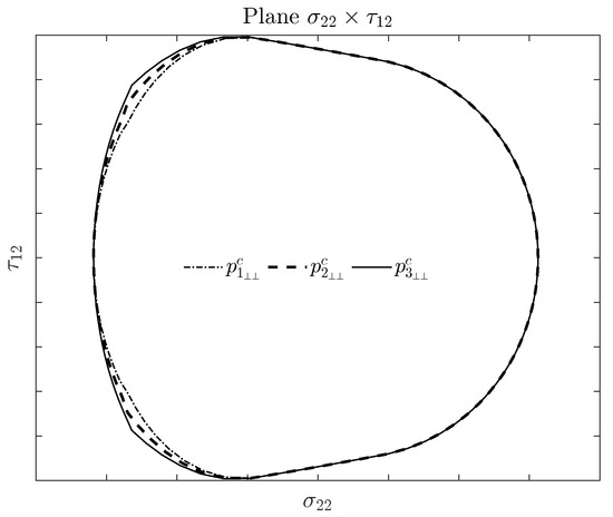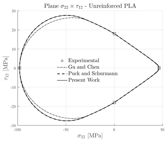 In order to provide more data for further discussion, although not in the context of reinforced materials, the failure envelopes have been plotted for an unreinforced 3D-printed material, namely PLA. The transverse and in-plane shear strengths of unreinforced 3D-printed PLA [15,43] are presented in Table 5. Although it is not a reinforced material, it can be seen in the literature that the deposited layers also behave as orthotropic lamina. Moreover, this material has a ratio , which could easily classify it as a semi-brittle material (see Table 2). Additionally, it can be mentioned that the ratio is significantly higher which leads to a less conservative predicted region under transverse compressive loading.