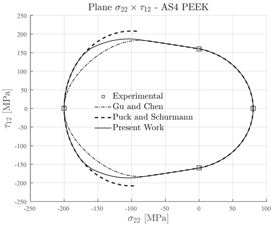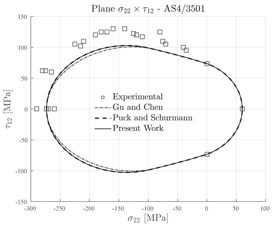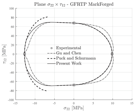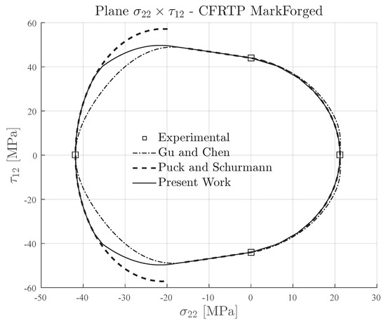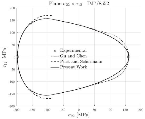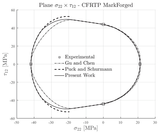 The obtained value for the inclination parameter is greater than those proposed by Puck et al. [56] for traditional materials. It is completely out of the range originally established. However, since it was not previously investigated, the authors believe that it could be a good initial value. The failure envelopes are respectively presented in Figure 12. The Gu and Chen failure envelope was computed with the inclination which was obtained according the theory proposed in [71]. It can be seen from Figure 12 that using the computed inclination parameter , the Expanded Puck and Schürmann provided good agreements with the failure envelopes of Puck and Schürmann and Gu and Chen. However, the Gu and Chen failure enveloped showed to be more conservative than the others.
