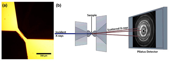 (a) Microscope image of two diamond anvils with an opposed configuration within a diamond anvil cell (DAC). Sample placement is centered on the culet, or flat tip, of one of the anvils. (b) Schematic of the DAC within experimental settings. Incident X-rays are propagated along the axis of compression and collected on a Pilatus 1M detector after sample scattering.