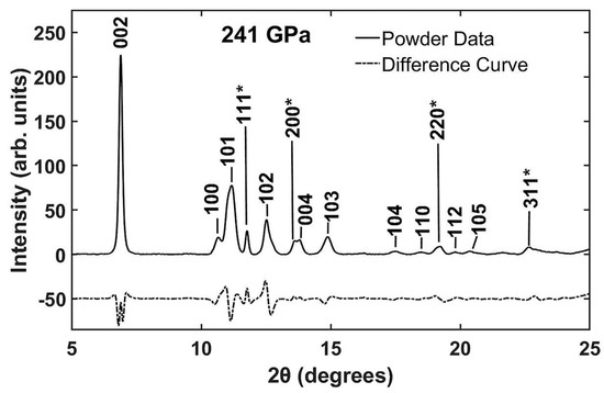 Figure 2 shows the integrated XRD powder data taken at the maximum pressure of 241 GPa with pressure determined using the platinum EOS [12]. The difference curve shown below the powder pattern in Figure 2 resulted from a fit to the hexagonal structure to ReB2. The hexagonal phase of ReB2 was found to be stable to the maximum pressure of 241 GPa. The measured lattice parameters at 241 GPa were a = 2.586 ± 0.004 Å and c = 6.882 ± 0.007 Å. Platinum peaks in Figure 2 are labeled with asterisks (*) and indexed to a face-centered cubic lattice. The platinum lattice parameter at maximum pressure of 241 GPa was measured to be a = 3.490 ± 0.009 Å.