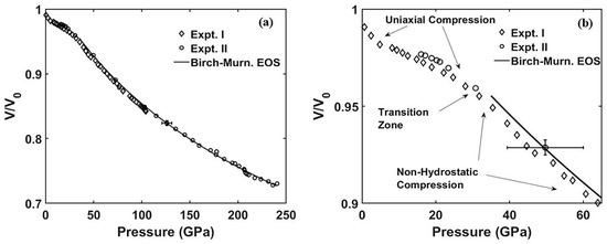 Figure 3a shows the volume compression for ReB2 in two separate compression experiments with maximum pressures to 105 GPa in Experiment I (Expt. I) and 241 GPa in Experiment II (Expt. II). Figure 3b shows the volume compression for low-pressure data that exhibit uniaxial compression transitioning into non-hydrostatic compression at around 35 GPa. Both Expt. I and II showed transition zones from uniaxial compression to non-hydrostatic. For data points below the transition zone, the samples showed a fairly linear volumetric compression that is similarly seen in elastic samples before yielding to plastic deformation above the transition zone. It can be inferred from Figure 3 that the sample yielding at 30 GPa is a measure of the uniaxial compression strength, or the material’s resistance to change before yielding. This is in agreement with the sample’s average hardness, or its resistance to deformation being between 30 and 60 GPa [4,5,6,7]. The bulk modulus and its pressure derivative are taken from Equation (1) by fitting to the non-hydrostatic curve above 35 GPa, and they were determined to be K0 = 364 GPa and K0´ = 3.53, respectively.