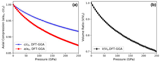 To simulate the high-pressure experiments, we performed structure relaxation DFT calculations with the GGA functional up to 250 GPa. The DFT-GGA axial and volume compressions simulated under hydrostatic pressure are shown in Figure 5a,b, respectively. The a/a0 and c/c0 curves with pressure are both concave up, suggesting that the upturn or concave down behavior observed experimentally at pressures between 5 and 35 GPa (Figure 3b) is related to a non-hydrostatic condition. Figure 5a also shows that the lattice parameter a is more compressible than c. In particular, the DFT-GGA value c/c0 near 240 GPa is 0.919, which is in excellent agreement with the experiment. The DFT-GGA value a/a0 near 240 GPa is 0.877, which underestimates the experimental value of 0.891. In addition to non-hydrostatic condition, the theory-experiment deviation at high pressure is most likely due to the employed GGA functional. In particular, compared with previous local density approximation (LDA) studies at 100 GPa [24], while in both LDA and GGA values c/c0 = 0.954, the LDA ratio a/a0 = 0.932 is larger than the GGA value of 0.928. Regardless of the functional being employed, it is clear that an anisotropic compression behavior persisted up to the maximum pressure under study: a/c began with 0.388 at ambient conditions and decreased monotonically to 0.370 (0.375) in theory (experiment) near 240 GPa.