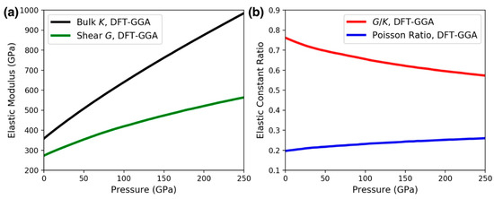 The addition of interstitial covalently bonded boron atoms to high-electron-density transition metals such as Re and Os has given a family of transition metal diborides with desirable mechanical properties. Re and Os, being one column away from each other on the periodic table, share similar properties, although Re has a slightly smaller electron density and Os has a higher hardness and incompressibility [25,26]. OsB2 was shown to have a comparable bulk modulus (342–365 GPa) to ReB2, but ReB2 is considered somewhat superior due to shorter metallic bonds [27,28]. There is also a noticeable difference between the brittleness and ductility of the two materials. Pugh [29] introduced the ratio between the shear modulus and the bulk modulus (G/K) to distinguish a material’s ductile or brittle behavior. A low (high) G/K value is correlated with ductility (brittleness). Based on the elastic and plastic properties of pure polycrystalline simple metals, an empirical value of the brittle-to-ductile transition is 0.571. Figure 6a shows the bulk and shear moduli computed by DFT using the GGA functional. While both G and K are enhanced by pressure, the rate of increase for K is larger, indicating that the G/K decreases with pressure, as seen in Figure 6b. In particular, G/K changes from 0.762 at 0 GPa to 0.627 at 240 GPa. In comparison, the G/K value is substantially smaller in OsB2 [30]. In our calculation, the G/K values for OsB2 at 0 GPa and 240 GPa are respectively 0.528 and 0.478, both of which are below the critical brittle-to-ductile transition value 0.571, showing that OsB2 is more ductile than ReB2. Another relevant quantity is the Poisson’s ratio, which can be obtained by (3K − 2G)/[2(3K + G)]. Based on Frantsevich’s rule [31], a material is brittle if its Poisson’s ratio is less than 1/3; otherwise, the material is ductile. Figure 6b also shows that the Poisson ratio for ReB2 increases with pressure, indicating an enhanced ductility.