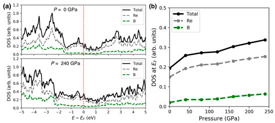 We next address the strong lattice anisotropy observed in ReB2. Interestingly, the hexagonal ReB2 and orthorhombic OsB2 both showed anisotropic behavior in lattice parameters, with the c-axis being the most incompressible [5,27]. The observed extreme anisotropy of ReB2 shown in Figure 4 is likely attributed to the high electron density of Re and the high density of states (DOS) at the Fermi level (EF) [4], which result in increased Coulomb repulsion with pressure. Figure 7a shows our computed DOS for ReB2 at 0 GPa (top panel) and 240 GPa (bottom panel). The DOS plots indicate that at EF (denoted by the vertical dashed red line), the spectra have a dominant contribution from the Re atom. At high pressure, the spectral contributions at EF from Re and B atoms both increase, as seen in Figure 7b. The enhanced DOS also suggests an increased metallic bonding, or a reduced covalent bonding, which is consistent with the iso-surface charge density plots in Figure 8: at ambient conditions, ReB2 possesses strong covalent bonds between B-B atoms. When external pressure increases, the hybridizations between Re-B and B-B atoms both increase, leading to an enhanced DOS at EF and a reduced directional bonding. The increased Re-B bonding states near EF also can lead to enhanced bulk and shear moduli at high pressure [32].
