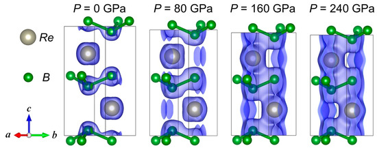 In the hexagonal phase of ReB2 (with space group P63/mmc), the two Re atoms are located at Wyckoff positions (1/3, 2/3, 1/4) and (2/3, 1/3, 3/4), and the four B atoms are located at (1/3, 2/3, ±z) and (2/3, 1/3, 1/2 ± z), where z is 0.0476 (0.0452) for P = 0 (240) GPa. The Re and B atoms are aligned along the c-axis. Under compression, as seen in Figure 8, the electron density is centered along the Re-B bonds, which are parallel to the c-axis. The strong electron Coulomb repulsion between charge density distributed along the Re-B bond direction makes the material highly incompressible along the c-axis. A strong anisotropy between the crystal a and c lattice parameters also suggests that the highest hardness in ReB2 single crystals is along the c-axis [5,33].