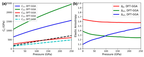 In addition to anisotropy in the lattice parameters, it is important to consider crystal elastic anisotropy, which is related to the occurrence of micro-cracks in materials [34,35]. Figure 9a shows the five independent elastic constants computed by DFT using the GGA functional for hexagonal ReB2 as a function of pressure. It is seen that c11 and c33 are largely enhanced upon compression, compared to the other elastic constants. Also, c33 is larger than c11, indicating that the c-axis is the least compressible. There are other ways to represent the level of elastic anisotropy of a material. In a hexagonal crystal, the following three parameters can be used [24,36]: ∆p = c33/ c11, ∆s1 = (c11 + c33 − 2c13)/4c44, and ∆s2 = 2c44/(c11 − c12). These three parameters would be equal to unity for isotropic compressibility. Figure 9b shows that the computed ∆p, ∆s1, and ∆s2 are all larger than 1 up to the maximum pressure under study. These results are consistent with previous lower-pressure theoretical studies [24,37], indicating a strong elastic anisotropy of ReB2, where its c-axis compressibility is smaller than that along the a-axis.