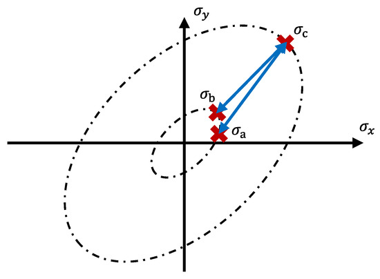 To avoid the described misrepresentation of damage inflicted, the modified Manson–McKnight method [69] is used. Instead of computing two scalar stress states and and deducing a scalar amplitude and a scalar mean stress, a two-dimensional stress amplitude and a two-dimensional mean stress are deduced from a two-dimensional maximum and minimum stress state: