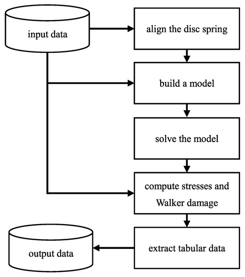 The algorithm starts with a surface mesh (given as an .STL file) of a disc spring placed randomly in space. After aligning the disc spring approximately symmetrically around the y-axis, it imports the geometry information into a finite element application. In our implementation of the algorithm, the finite element application was used. Through the Abaqus Scripting interface [70,71], it builds a model around the geometry data, using additional inputs like loads and friction coefficients provided by the user. It generates an output database file using the Abaqus/Standard Solver. Utilizing Abaqus/Viewer functionalities via the Scripting interface, a field of residual stresses is generated from input data. Aggregated minimum and maximum stress fields are computed by superposing the computed load stress field and the residual stress field. A Walker damage parameter field is computed from the minimum and maximum stress fields. The Walker damage parameter at the surface of the disc spring is computed and exported as tabular data.
