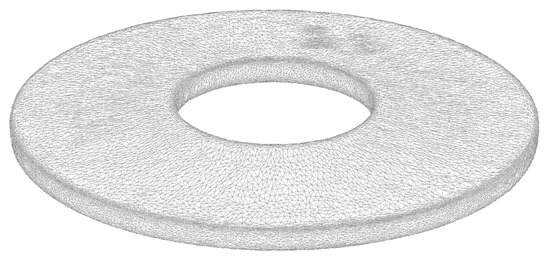 In this section, an example application of the algorithm presented in Section 3 is given. A single disc spring was modelled. The surface mesh of the disc spring under investigation is presented in Figure 5. The mesh was obtained using the commercially available 3D-scanning device GOM ATOS and the software GOM Scan. The number of surface triangles was already reduced for the displayed mesh, from 253,904 to 50,152. Convergence studies with different loads showed this mesh to be a good compromise between computational cost (about seven hours of CPU time on a i7-9800X and 16 GB of RAM vs. about 110 h of CPU time and 115 GB of RAM for the 253,904 surface triangle model) and accuracy (no significant bias of the Walker damage-surface area plot) [4].