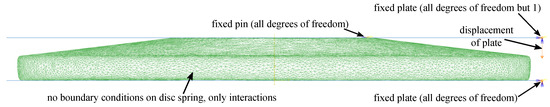 The volumetrically meshed disc spring was incorporated into an assembly. The load cycle was implemented in four steps. To obtain good convergence behavior, the steps were defined as dynamic steps. The implicit solver Abaqus/Standard was used. The purpose of Step 1 was to apply the lower load. Step 2 was to make sure there was no dynamic influence on the computed stresses. Step 3 was to apply the higher load. Step 4 was, again, implemented to eliminate dynamic influences. Step times for Steps 1 to 4 were 10 s, 1 s, 10 s. and 1 s. The boundary conditions were applied to the upper plate as displacements in the axial direction at a reference point; see Figure 6. The prescribed displacements were 0.425 mm for Steps 1 and 2 and 1.19 mm for Steps 3 and 4. All other degrees of freedom of the reference points were fixed to zero. For the lower plate, all degrees of freedom were fixed to zero.