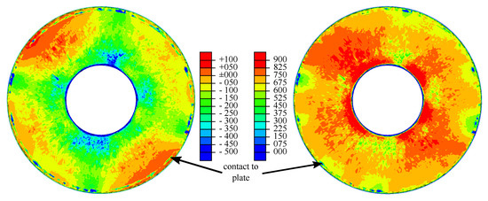 Based on these, field outputs describing the minimum and maximum equivalent stress, and , were computed according to Equations (2) and (3); see Figure 10. Especially in the minimum equivalent von Mises stress visualization, the contact line between the disc spring and the lower plate can be identified by a circle of locations with high compressive stresses.