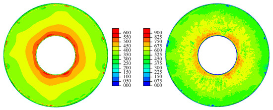 Residual stresses and in the tangential (left) and radial (right) direction in MPa.