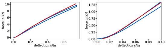 The Walker damage parameter is not directly accessible through experiments. To evaluate the quality of the finite element model, a characteristic derived from a similar model (only boundary conditions were changed) was compared to a characteristic obtained in an experiment; see Figure 13. As is customary for disc springs, the deflection was normalized over the deflection at which the disc spring lies flat on the ground. They agree well; especially, the correct representation of the progressive behaviour at the very start of the experiment has only been achieved by models directly implementing 3D-scanned geometry. To our knowledge, all published models directly implementing 3D-scanned geometry have been created using the algorithm presented in Section 3. The numerical characteristic is somewhat stiffer than the experimental one. This may be due to a misrepresentation of Young’s modulus, which was set to the normative default of 206,000 MPa; however, tensile tests on specimens from the same batch of material and a similar heat treatment did not show a sufficient deviation in Young’s modulus to use a lower value.