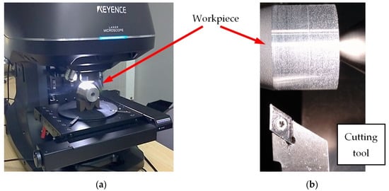 The following measurements were taken: surface roughness and topography and the microscopic measurements of the machined surface. The measurements were captured with Talysurf 50 surface profiler manufactured by Taylor Hobson (2 New Star Rd, Leicester, UK). The microscopic analysis of the machined surface was carried out using a VK-X1000 3D microscope by Keyence (Osaka, Japan) (Figure 1) with a resolution of 0.5 nanometers in the Z axis and 130 nanometers in the XY axis. The imaging field was 705 microns in the X axis and 528 microns in the Y axis.