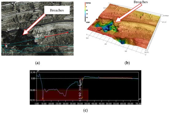 Example of surface measurement with a 3D microscope: (a) 2D surface view, (b) turned surface imaging (3D presentation), and (c) material breach measurement on a machined surface.