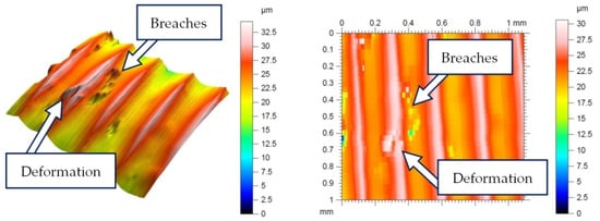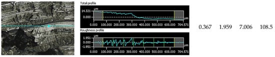 The analysis of the microscopic measurement results show numerous breaches occurring after the machining of the surface of the workpiece made with additive technology. Figure 2 presents example microscopic images of the aluminum alloy surface after machining. The surface roughness was measured for each layout of the adopted test plan. The example measurement results are shown in Figure 3.