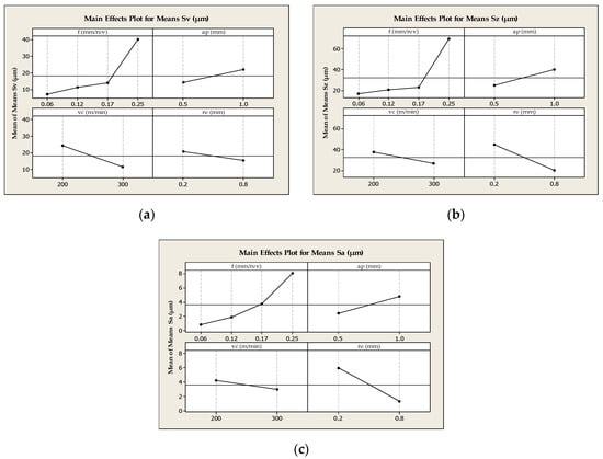 Influence of the cutting data on the values of the 3D surface parameters (a) Sv (μm), (b) Sz (μm), (c) Sa (μm).