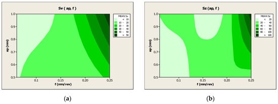 Figure 5 graphically shows the influence of the particular cutting data on the values of the 3D surface parameters Sv, Sz, and Sa. Figure 6 shows the surface roughness parameters Sv and Sz depending on the feed variables f and cutting depth ap.