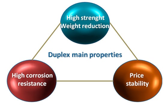 Taking under consideration such conditions, duplex steels and cast steels with a comparable proportion of the basic phases—ferrite and austenite—present a better set of mechanical properties compared to traditionally used ferritic or austenitic steels. The main area of application are the chemical industry, construction of warehouses, tanks of vessels transporting products with high chemical activity (acid phosphoric, concentrated sulfuric acid, highly alkaline media) or equipment used: in the energy production, pulp, paper, food and petrochemical industries [9,10,11,12,13,14,15,16,17]. Figure 2 show the key advantages of duplex steels and cast steels.